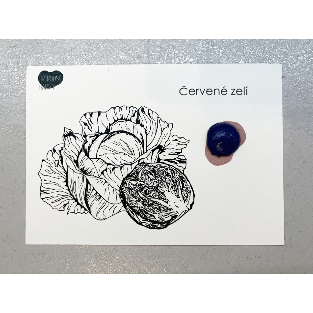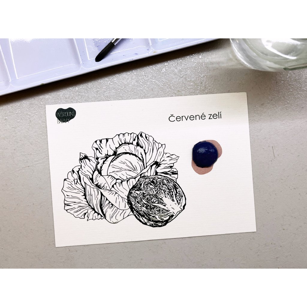 Kartička se vzorkem akvarelu šeříkově fialové barvy, který byl vyroben z červeného zelí.