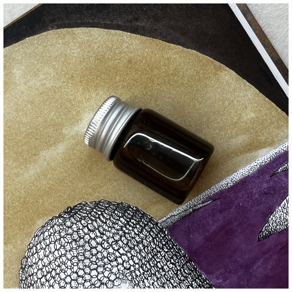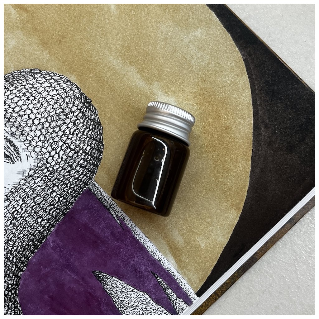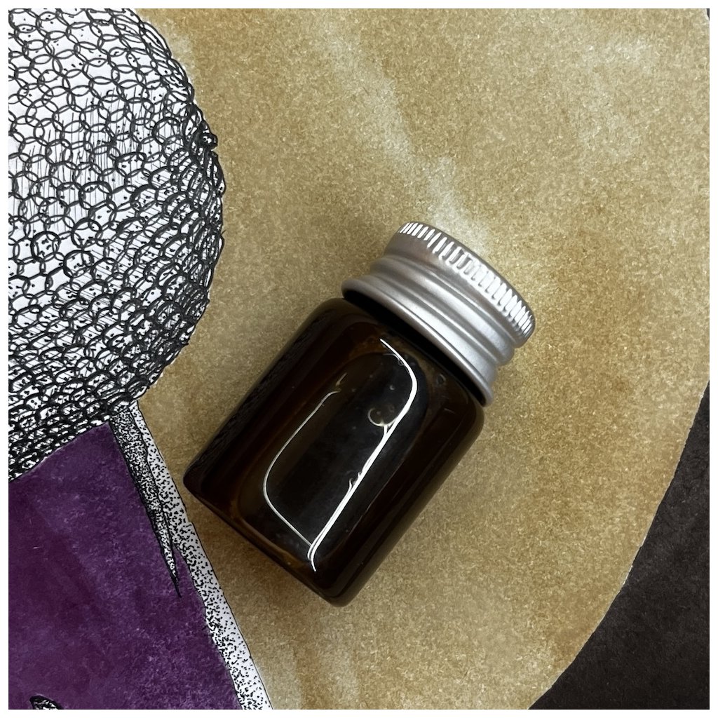 Ručně vyrobený přírodní inkoust hnědé barvy ve skleněné lahvičce o objemu 10ml.