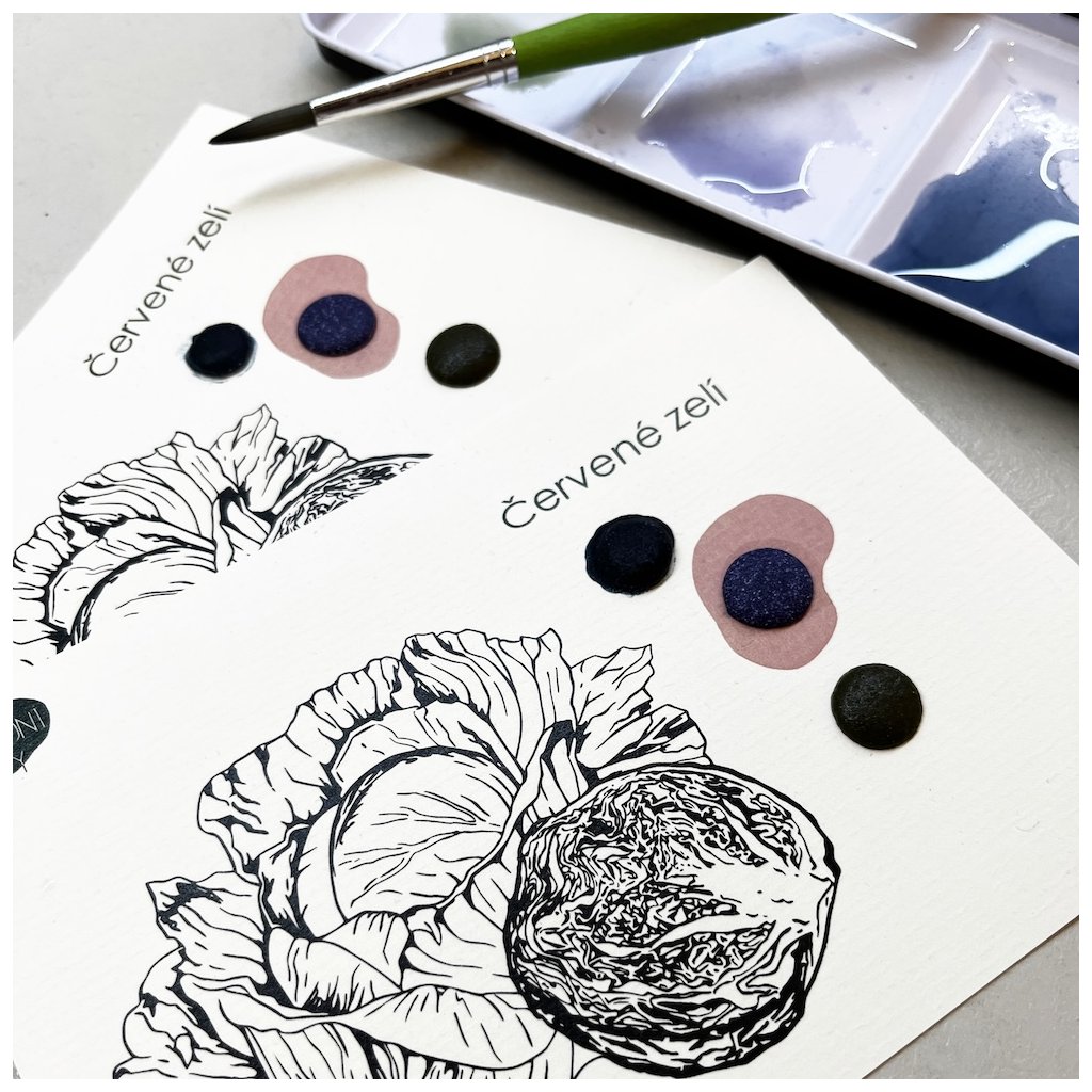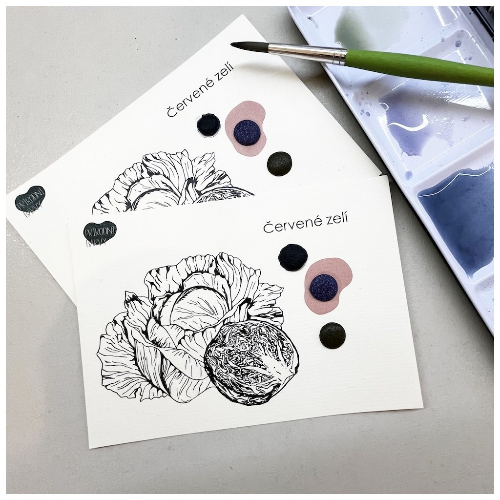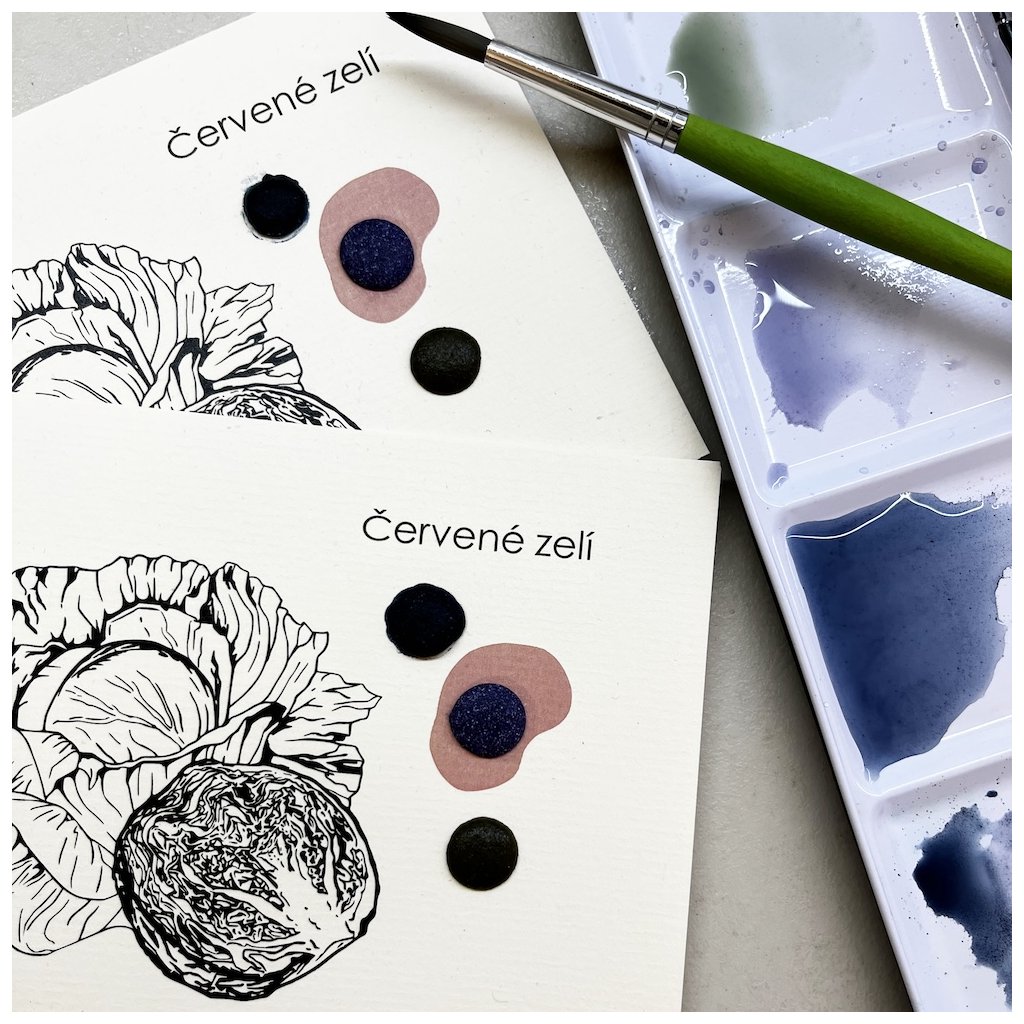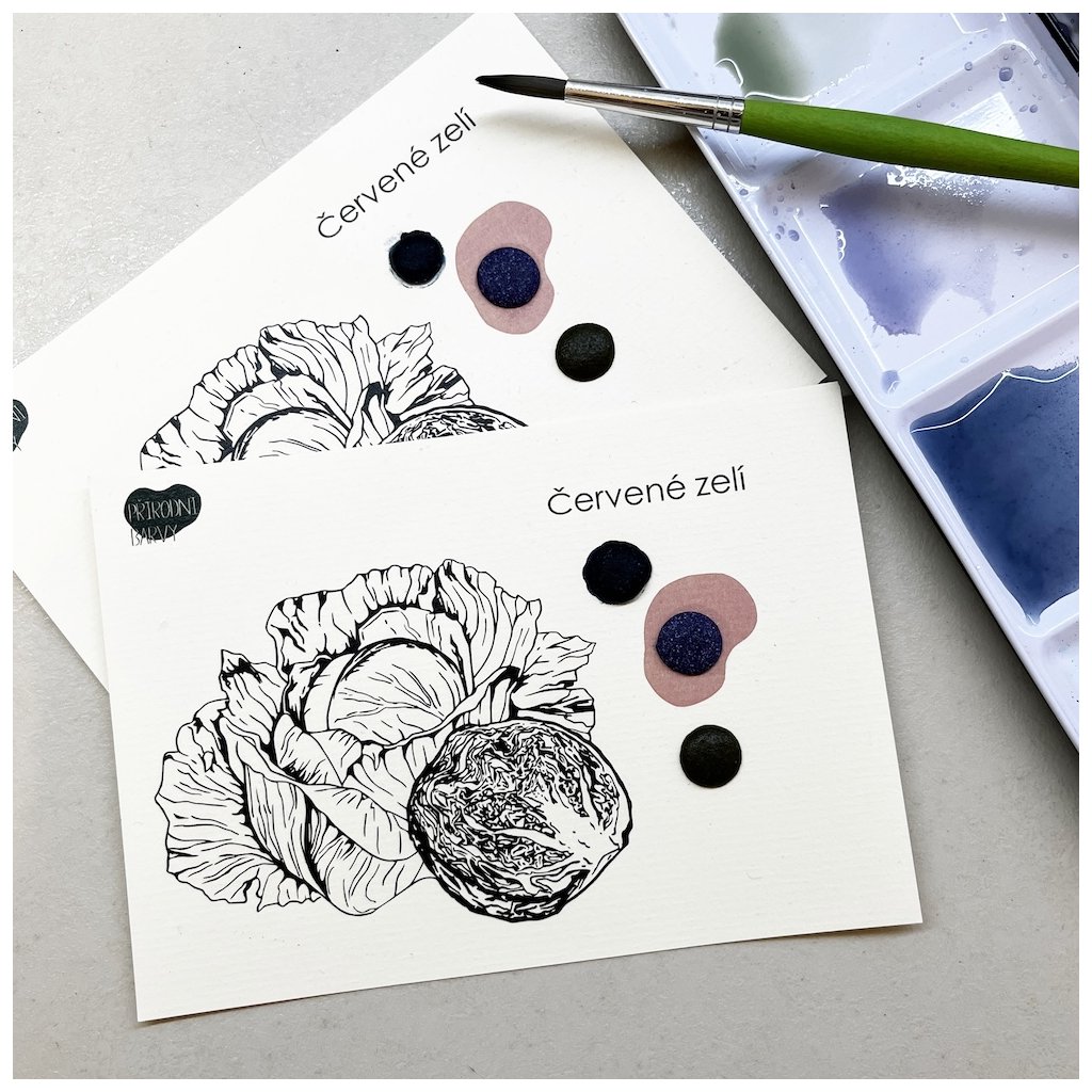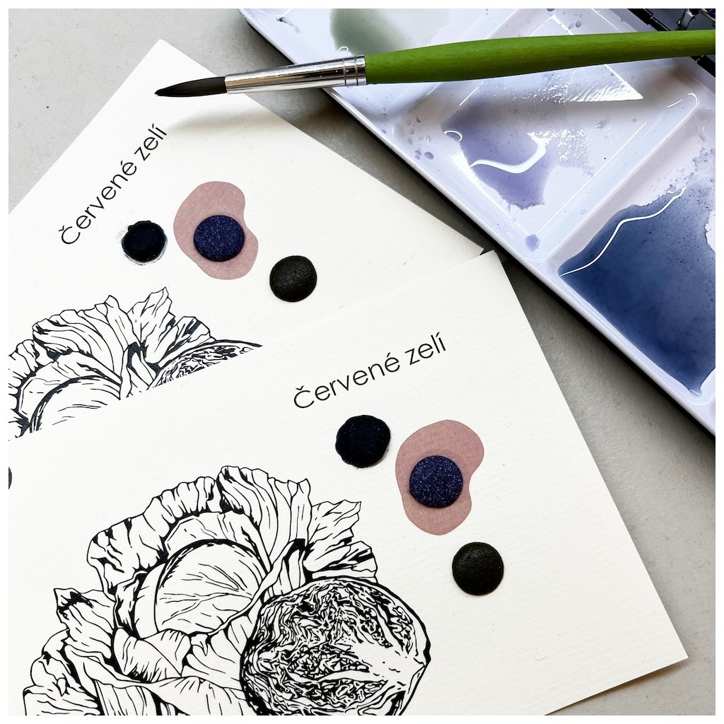 Kartička obsahuje 3 vzorky ručně vyrobeného akvarelu, jehož pigment byl vyroben z červeného zelí.
